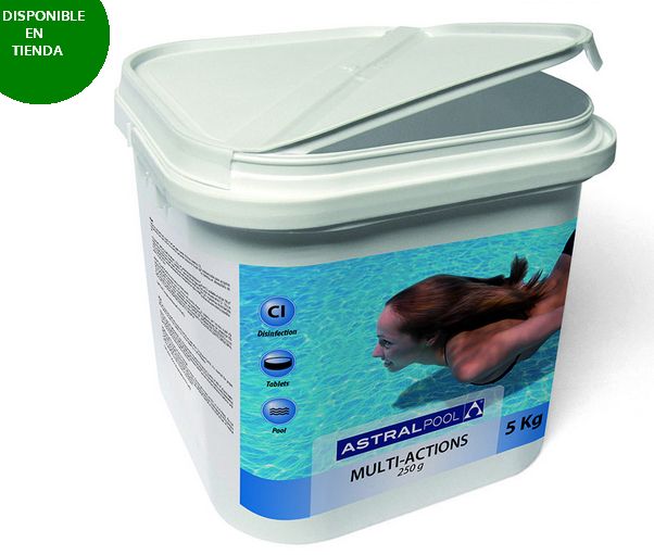 Compuesto sólido NO COMBURENTE en tabletas, especialmente formulado para que con una sola aplicación en el agua de la piscina se consiga eliminar las bacterias, virus y microorganismos en general, evitar el desarrollo de las algas y mantener ytansparente y cristalina el agua. Bote de 5 Kgs