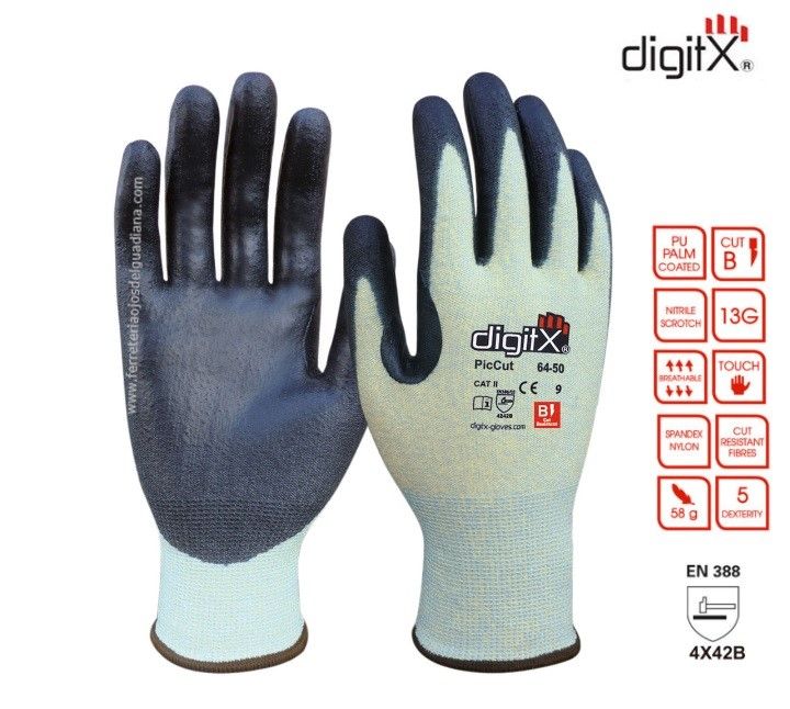 GUANTE DIGITX PICCUT 64-50 Protección contra cortes Revestimiento de HPPE 13G con revestimiento de poliuretano. Muy buena protección contra cortes: nivel B . El dorso de la mano no tiene recubrimiento para una buena transpirabilidad Combina protección contra cortes con agarre de aceite, excelente destreza, sensibilidad y tacto. Un puño elástico asegura un ajuste seguro, evitando la suciedad.