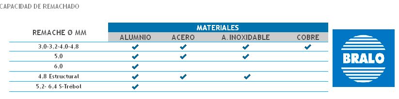 La remachadora Bralo BM-160 es una herramienta de palanca muy robusta, concebida para el uso profesional, tanto en interiores como en exteriores. Es la herramienta apropiada para aquellas aplicaciones donde se empleen remaches Bralo de 3,0 a 5,0 mm de cualquier material, así como 6,0 en aluminio, estructurales de 4,8 mm o S-trébol de 5,2 y 6,4 mm.
