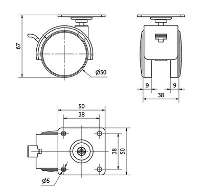 Soporte giratorio, platina de 38x38mm, 50Kg. de capacidad de carga, cojinete liso.